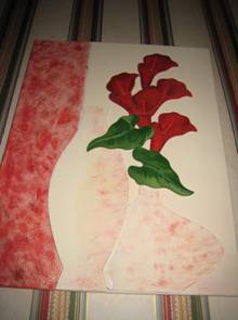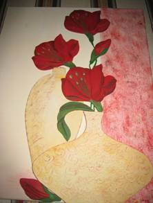 bois: vases, fleurs, feuilles) Technique utilisée : peintures acryliques, pâte structurante, dorure à la feuille d'or, colle |