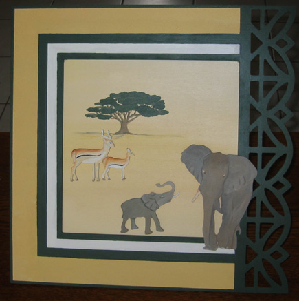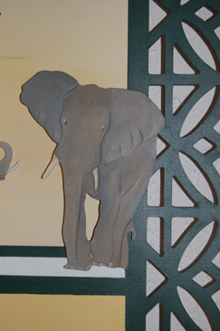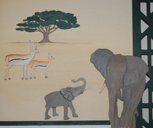 bois: gazelles, éléphants) Technique utilisée : peintures acryliques, pâte structurante, colle