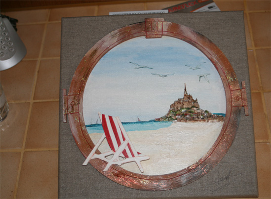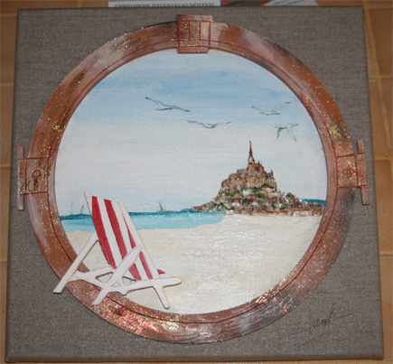 rapportés: (hublot 27x28 chaise longue) Technique utilisée : peintures acryliques, pâte structurante, sable, dorure à la feuille or et cuivre, colle,